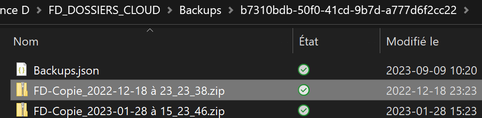 Si vous supprimez ou déplacez les fichiers .zip qui sont dans ce dossier de backups, le logiciel ne les trouvera plus. Donc, à moins d'une raison précise, veuillez de gérer vos backups à l'intérieur du logiciel. La bonne manière de gérer les copies de sauvegardes est expliquée dans le guide suivant: Copies de sauvegardes