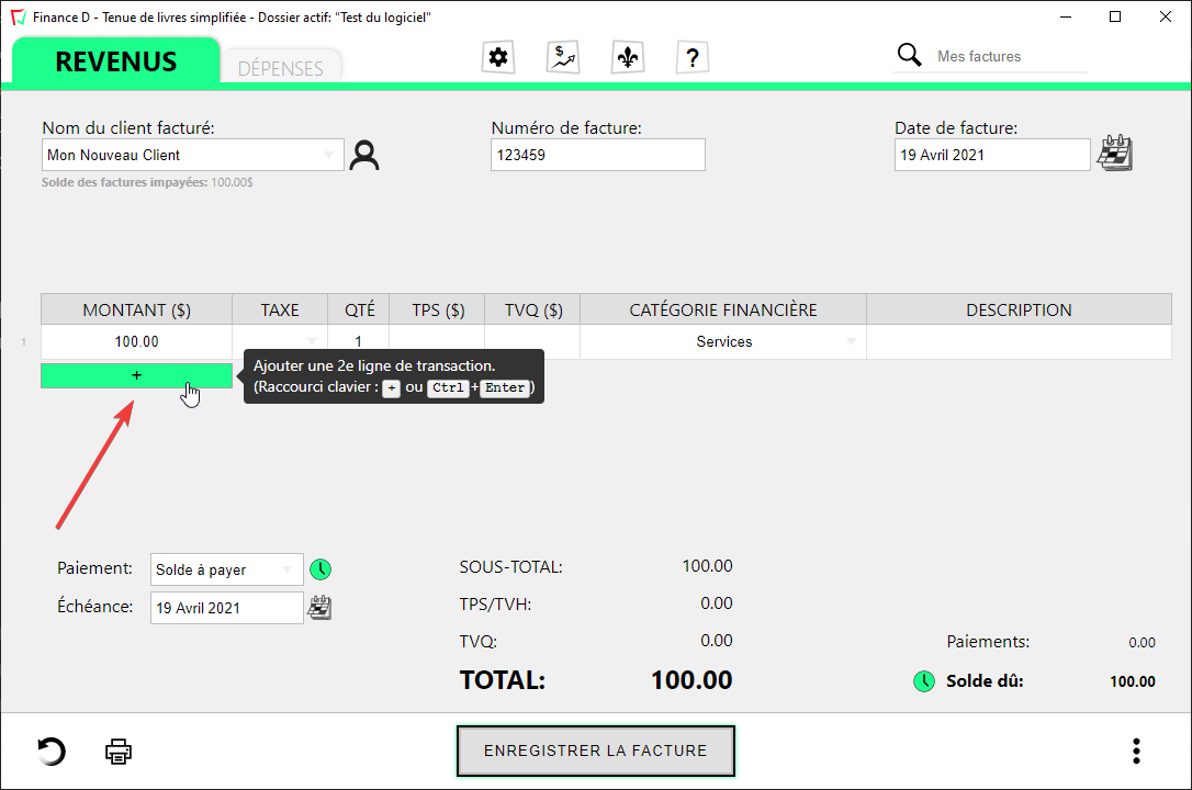 Lorsque votre curseur est situé dans une ligne de transaction, vous pouvez utiliser un des deux raccourcis clavier pour créer la nouvelle ligne plus rapidement. Soit Ctrl+Enter ou la touche "+" sur votre clavier.