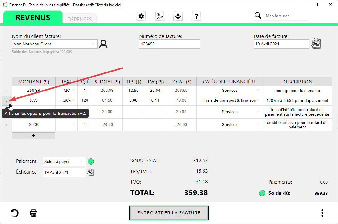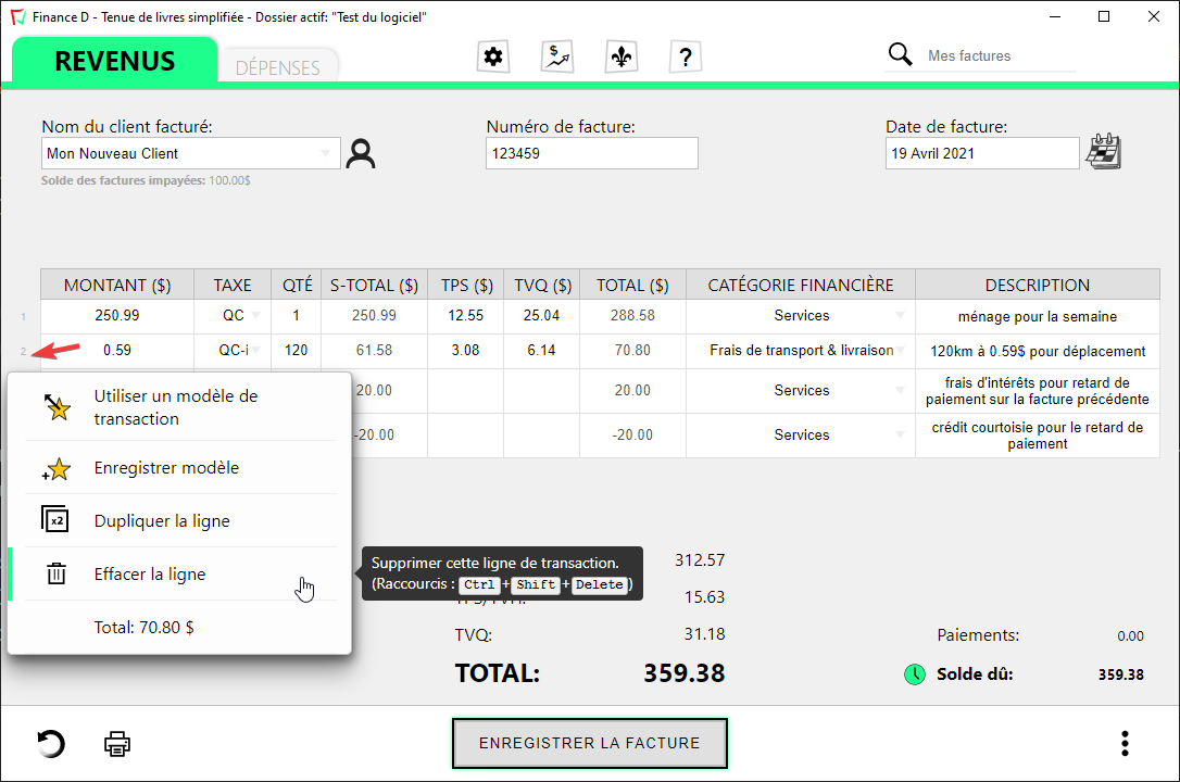 La première façon d'afficher le menu d'options d'une ligne, est de cliquer sur son numéro à gauche. La deuxième méthode est de faire un clic droit à l'intérieur d'une cellule de cette ligne de transaction.